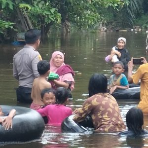 TAMBANG- Kapolsek Tambang AKP Marupa Sibarani bersama personil rela arungi banjir untuk melihat warganya yang berdampak banjir sekaligus memberikan bantuan sembako kepada mereka di Desa Palung Raya Kecamatan Tambang, Jum’at (29/12/2023) sekira pukul 16.00 WIB.
