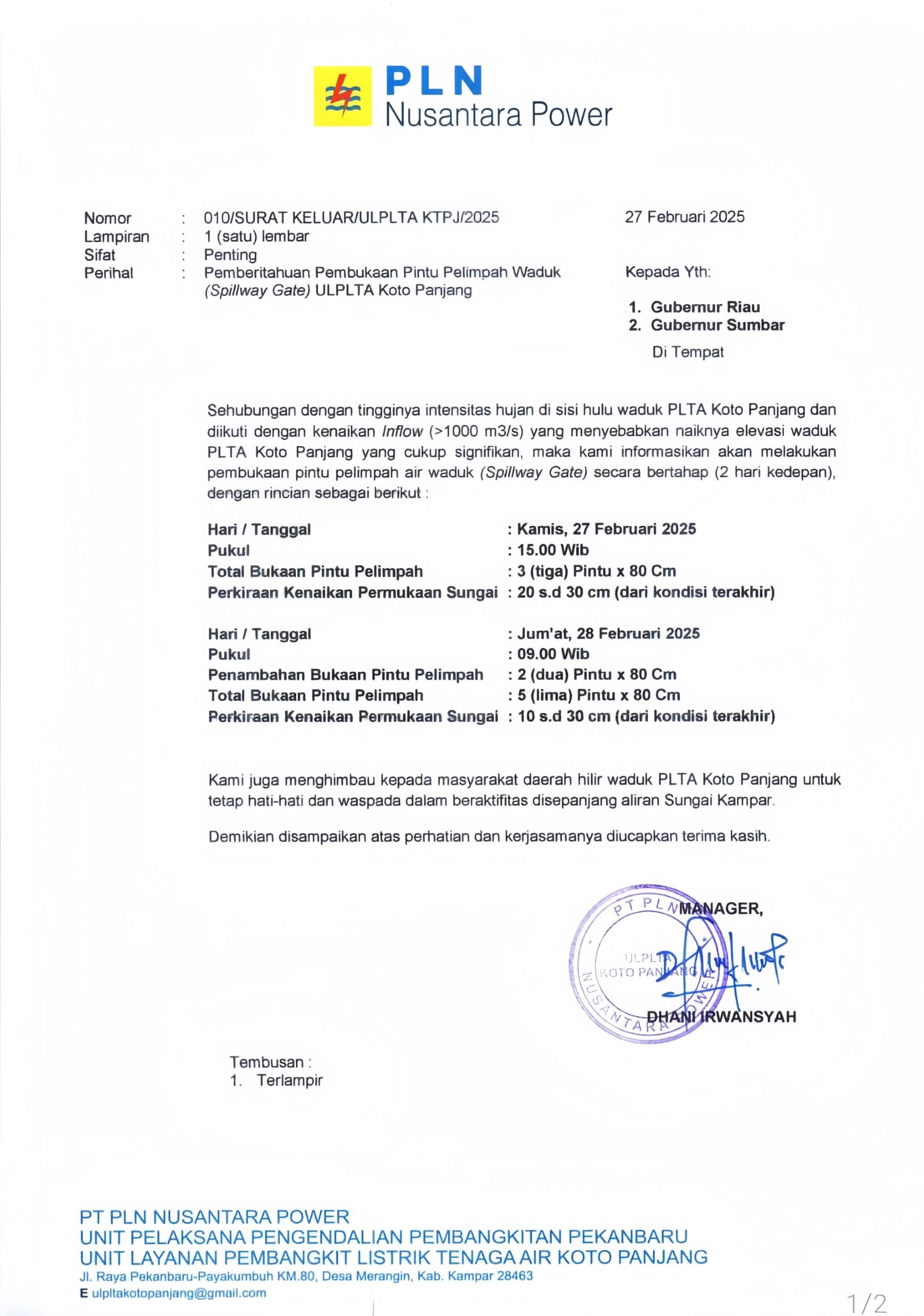 Demikian disampaikan Kepala Dinas Kominfo dan Persandian Kabupaten Kampar H. Salmi Hadi, Kamis ( 27/02/25) saat menerima surat pemberitahuan dari PLN Nusantara selaku pengelola waduk PLTA Koto Panjang dengan nomor surat 010/SURATKELUAR/ULPLTA KTPJ/2025 tanggal 27 Februari 2025 tentang Pemberitahuan Pembukaan Pintu Pelimpah air waduk (Spillway Gate) UPPLTA Koto Panjang.