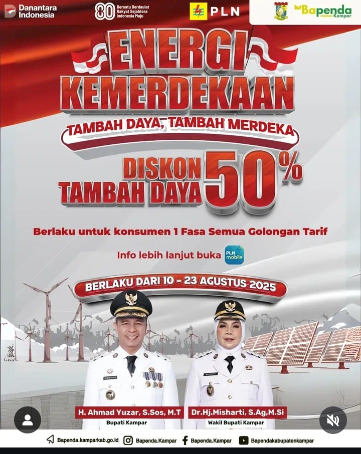 Kamparnews – BANGKINANGKOTA – Badan Pendapatan Daearah (Bapenda) Kabupaten Kampar gencar melakukan optimalisai PAD Kabupaten Kampar diantaranya melalui sektor Pajak Barang Jasa Tertentu Tenaga Listrik (PBJT -TL). Bahkan saat ini Bapenda Kabupaten Kampar bersama pihak PLN ULP Bangkinang tengah melakukan sosialisasi diskon dalam rangka menyemarakkan Hari Ulang Tahun ke-80 Kemerdekaan Republik Indonesia, PT PLN (Persero) menghadirkan program spesial bertajuk “Energi Kemerdekaan”. Melalui program ini, pelanggan dapat menikmati diskon tambah daya listrik 50 persen yang berlangsung mulai 10 hingga 23 Agustus 2025.