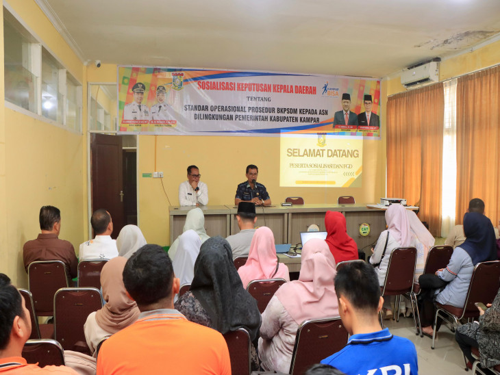 Kamparnews – BANGKINANGKOTA – Kepala Badan Kepegawaian dan Pengembangan Sumber Daya Manusia (BKPSDM) Kabupaten Kampar, Syarifuddin, membuka secara resmi kegiatan Sosialisasi Keputusan Kepala Daerah tentang Standar Operasional Prosedur (SOP) BKPSDM kepada Aparatur Sipil Negara (ASN) di lingkungan Pemerintah Kabupaten Kampar. Kegiatan ini dilaksanakan di Aula Berakhlak BKPSDM, Jumat (15/8/25), Sosialisasi tersebut di ikuti oleh seluruh Organisasi Perangkat Daerah (OPD) Kabupaten Kampar.