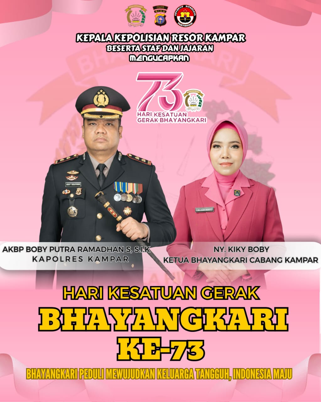Seluruh staf dan jajaran Polres Kampar turut menyampaikan ucapan selamat dan apresiasi sebagai wujud dukungan terhadap Bhayangkari. Peringatan HKGB ke-73 di Polres Kampar diharapkan dapat semakin mempererat tali silaturahmi dan meningkatkan semangat kebersamaan dalam mewujudkan Polri yang profesional, modern, dan terpercaya, serta keluarga yang tangguh dan harmonis.***