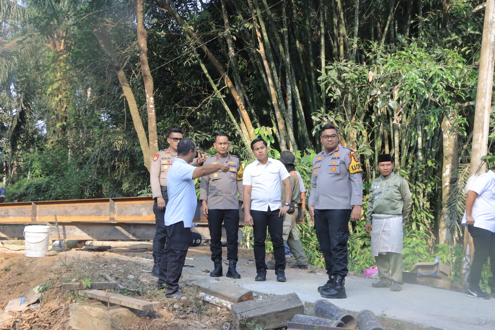 Pukul 16.30 WIB, rombongan Kapolres tiba di lokasi pembangunan jembatan yang menjadi urat nadi penghubung bagi masyarakat Desa Lubuk Agung dan sekitarnya. Kedatangan Kapolres disambut antusias oleh Kepala Desa Lubuk Agung, personel Satgas Darurat pembangunan jembatan, para pekerja, dan masyarakat setempat.